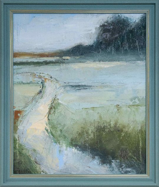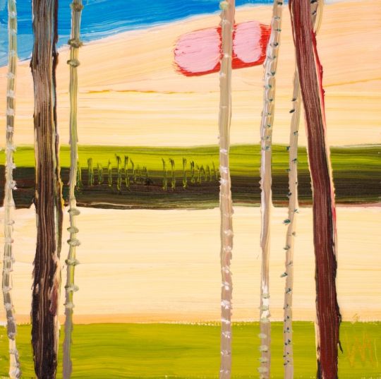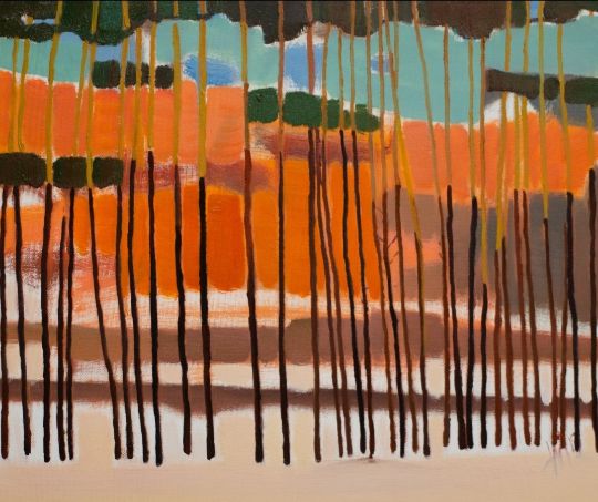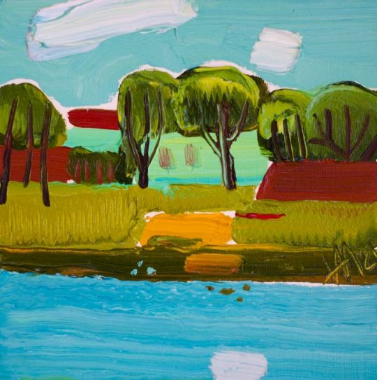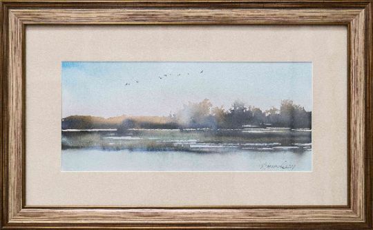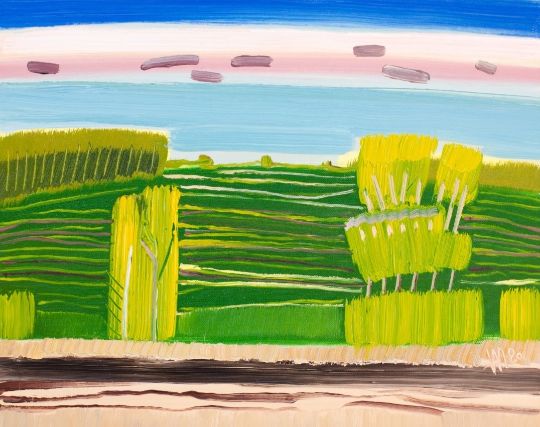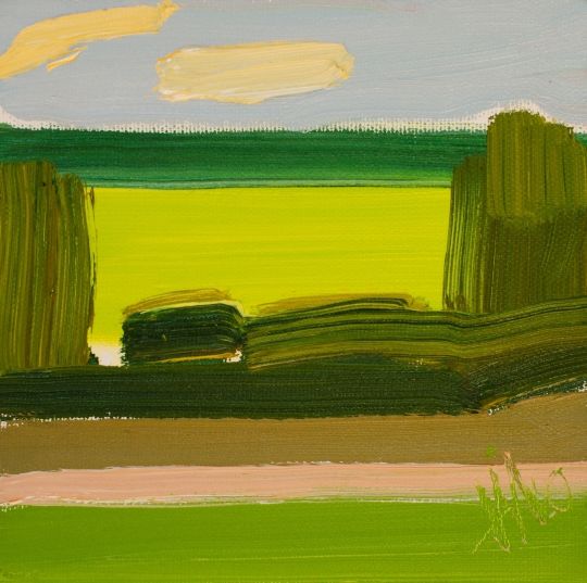Пленэрная работа, написана в окрестностях Сарова. Небо стилизовано, создавая эффект водоема на горизонте, на самом деле здесь поля с озимыми.