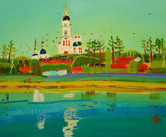 Этюд с натуры у стен Дивеевского монастыря. Наивный подход здесь особенно бросается в глаза, поверхность воды напоминает рисунок на ткани, постройки и деревья создают ритм и тянутся друг к другу.