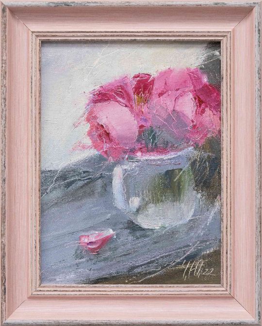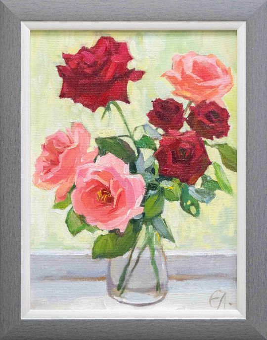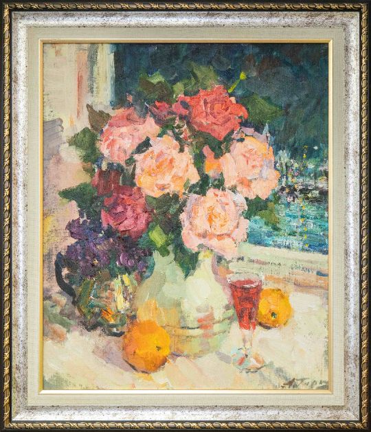 На создание этой работы вдохновила ее рама, заказанная под другой проект. В нее стал проситься ранее начатый и отложенный букет теплых роз, который был завершен с большим вдохновением.