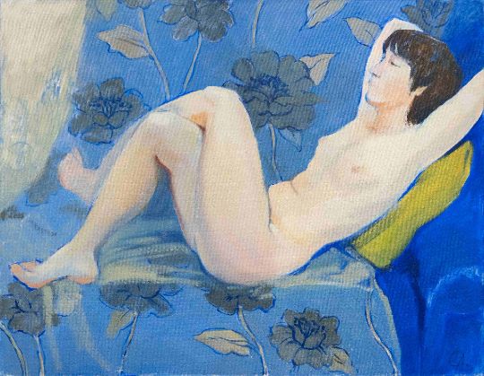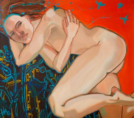 Обнаженная натура часто встречается в работах автора. Работа из серии ХОХЛОМА легка и воздушна. Фон максимально лаконичен, гармония цветов известной росписи задает настроение. Фигура прописана прозрачными слоями. Работа с натуры, позировала модель.
