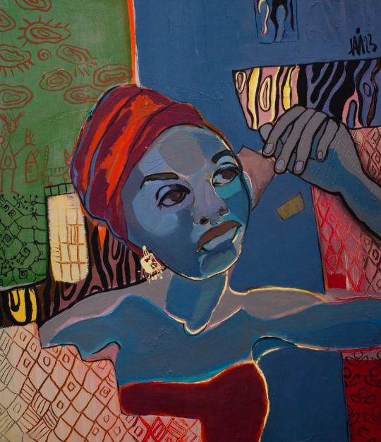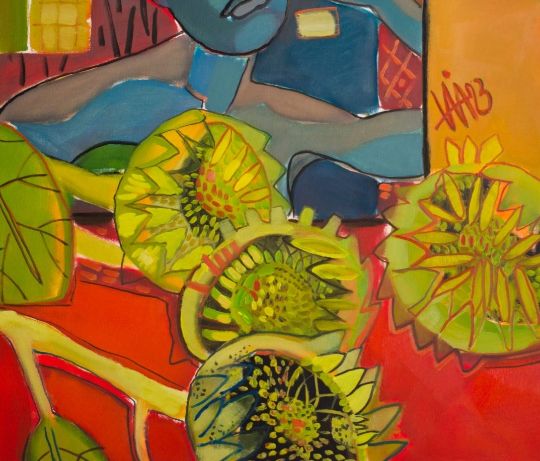 Экспериментальная работа в несвойственной автору технике. Прототипом сюжета стала фотография джазовой певицы, пианистки и композитора Нины Симон. Работа идеально сочетается с "Подсолнухами на красном", так как использована в качестве реквизита в постановке для нее.