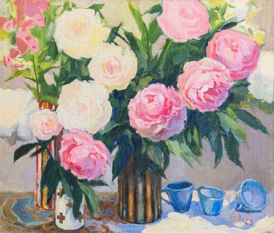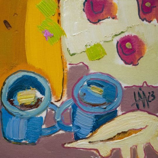 Чашка очень частый предмет в натюрмортных работах автора. Обратная перспектива дает возможность заглянуть внутрь, увидеть содержимое - чашки обязательно наполнены. Еще одна авторская особенность - это отражение в чашках, там вы часто можете увидеть небо.