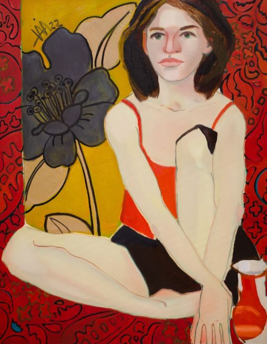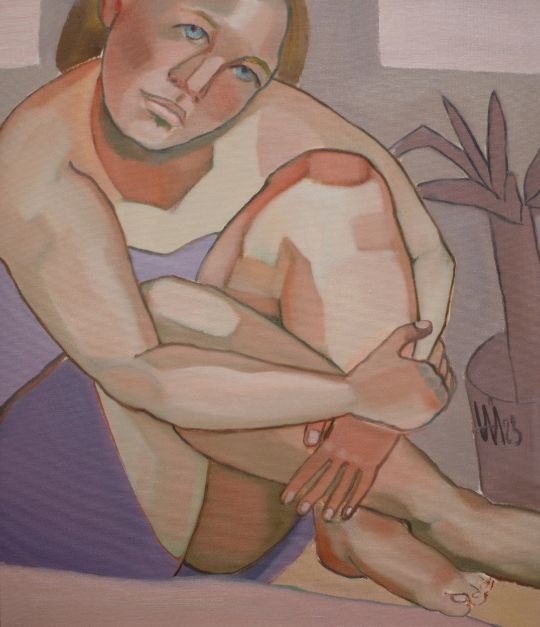 Интерьерный портрет. Использование разных подходов на одном холсте, что выделяет технику автора: многослойность соседствует с пятнами локального цвета, в построении фигуры присутствуют элементы наива. Работа с натуры, позировала модель.