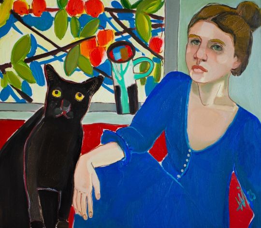 Интерьерный портрет из серии "Человек и кошка", где участвуют люди со своими питомцами. В качестве фона использована другая работа автора, что нередко встречается в его постановках. Кот своей мастью и размерами дал отсылку к Бегемоту, поэтому название Маргарита, хотя хозяйку зовут не так на самом деле.