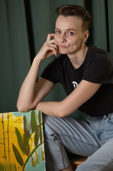 Интерьерный портрет. Использование разных подходов на одном холсте, что выделяет технику автора: многослойность соседствует с пятнами локального цвета, в построении фигуры присутствуют элементы наива. Работа с натуры, позировала модель.