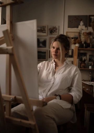 В постановке в качестве реквизита участвует картина Нина, формат холстов и цвет торцов делает эти две работы ижеальным сэтом, который способен стать центральным пятном в современном интерьере